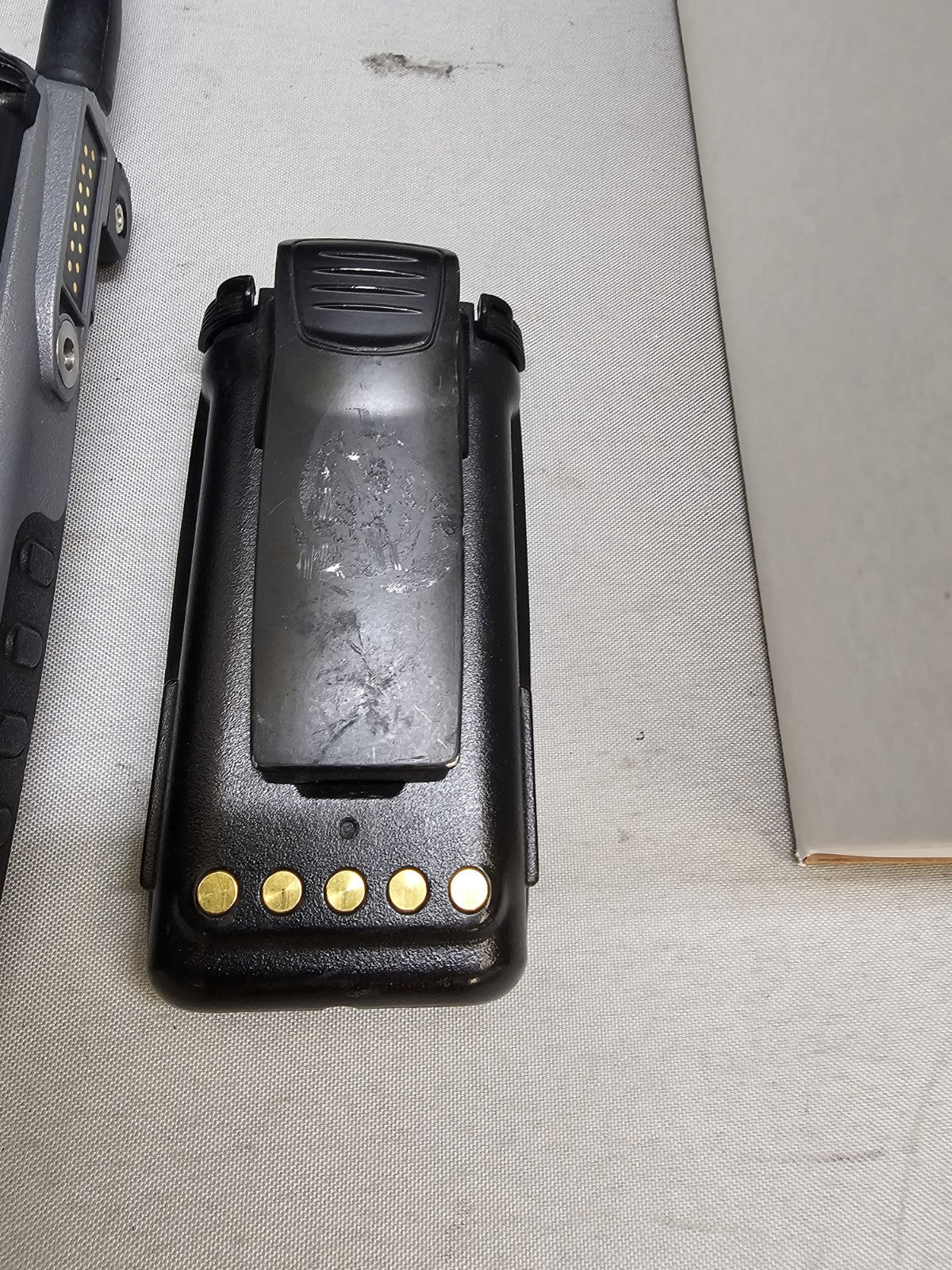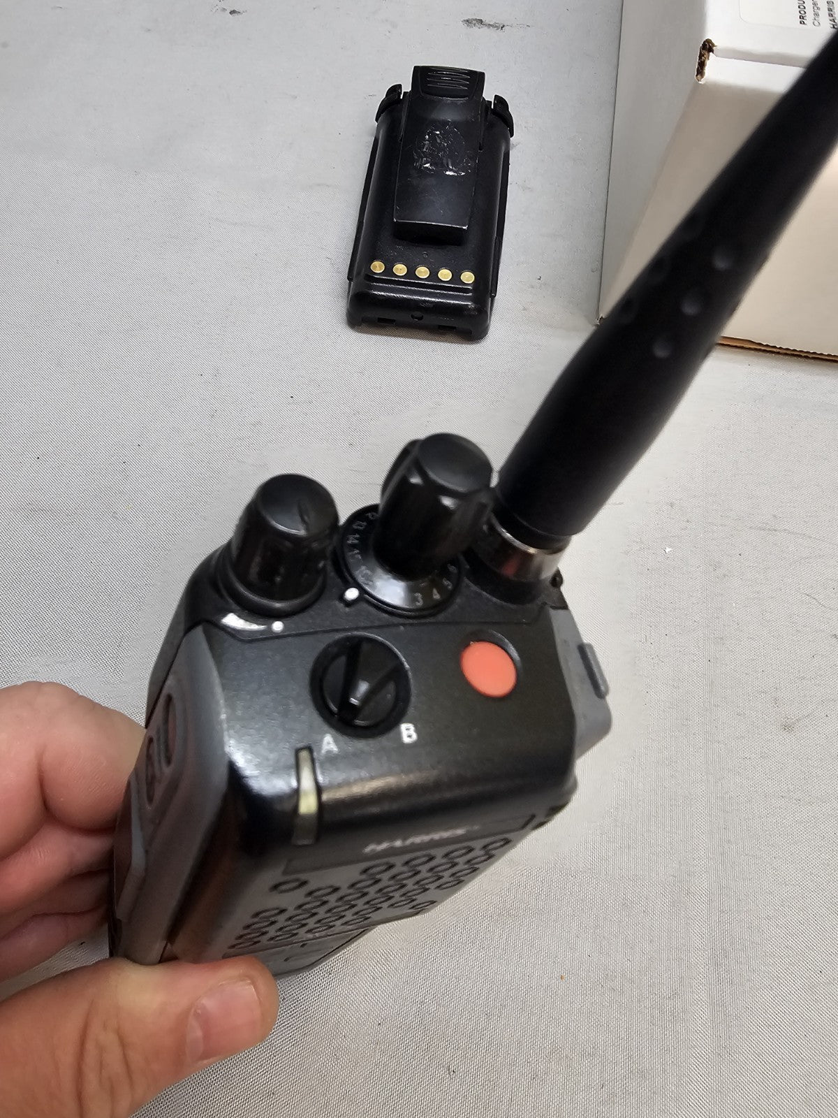 Nice radio with nice set of features. NEW CHARGER. The channel selector switch has some play in it but functions fine. We do not program. Thanks for your interest.