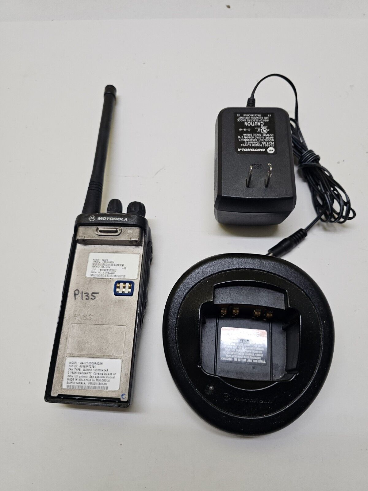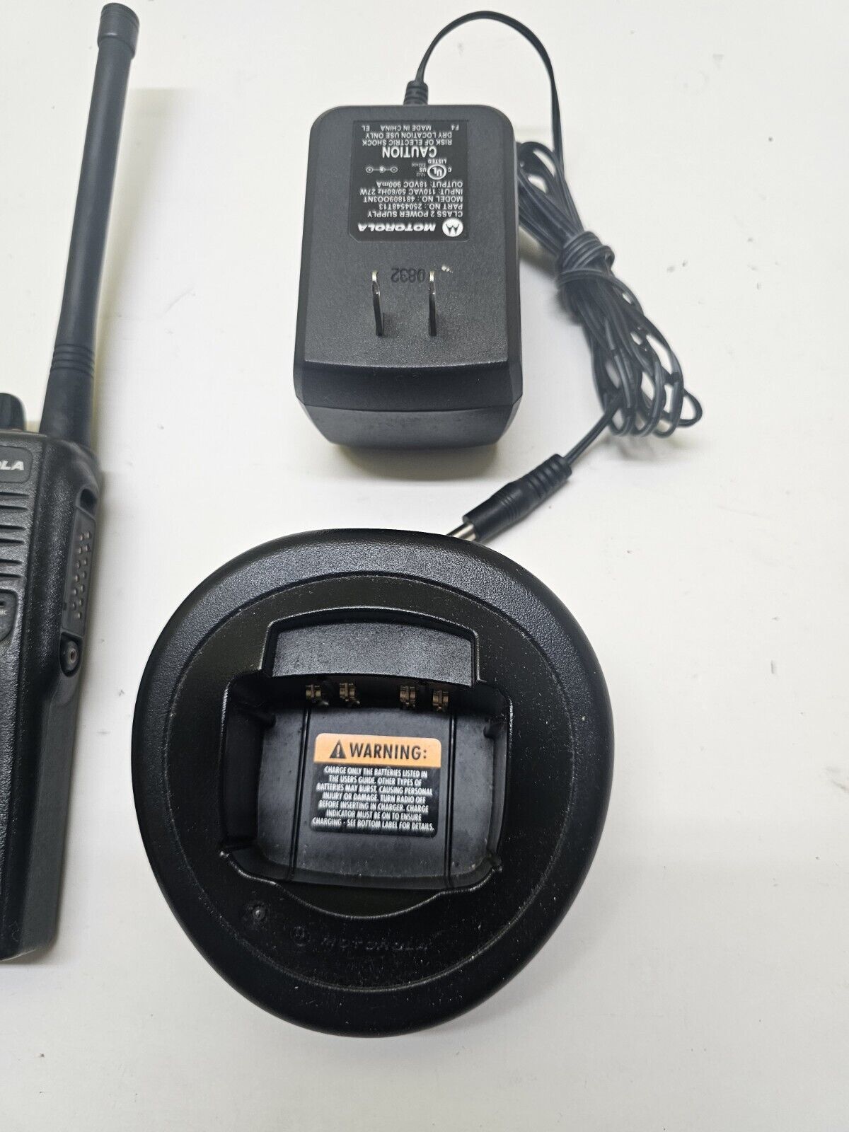 As pictured in working used condition. We do not program. Radio, antenna, and charger - no battery.